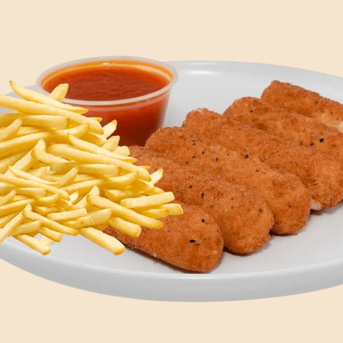 Golden-fried mozzarella cheese sticks with a crispy coating, served with a side of zesty marinara sauce and accompanied by a generous portion of crispy fries