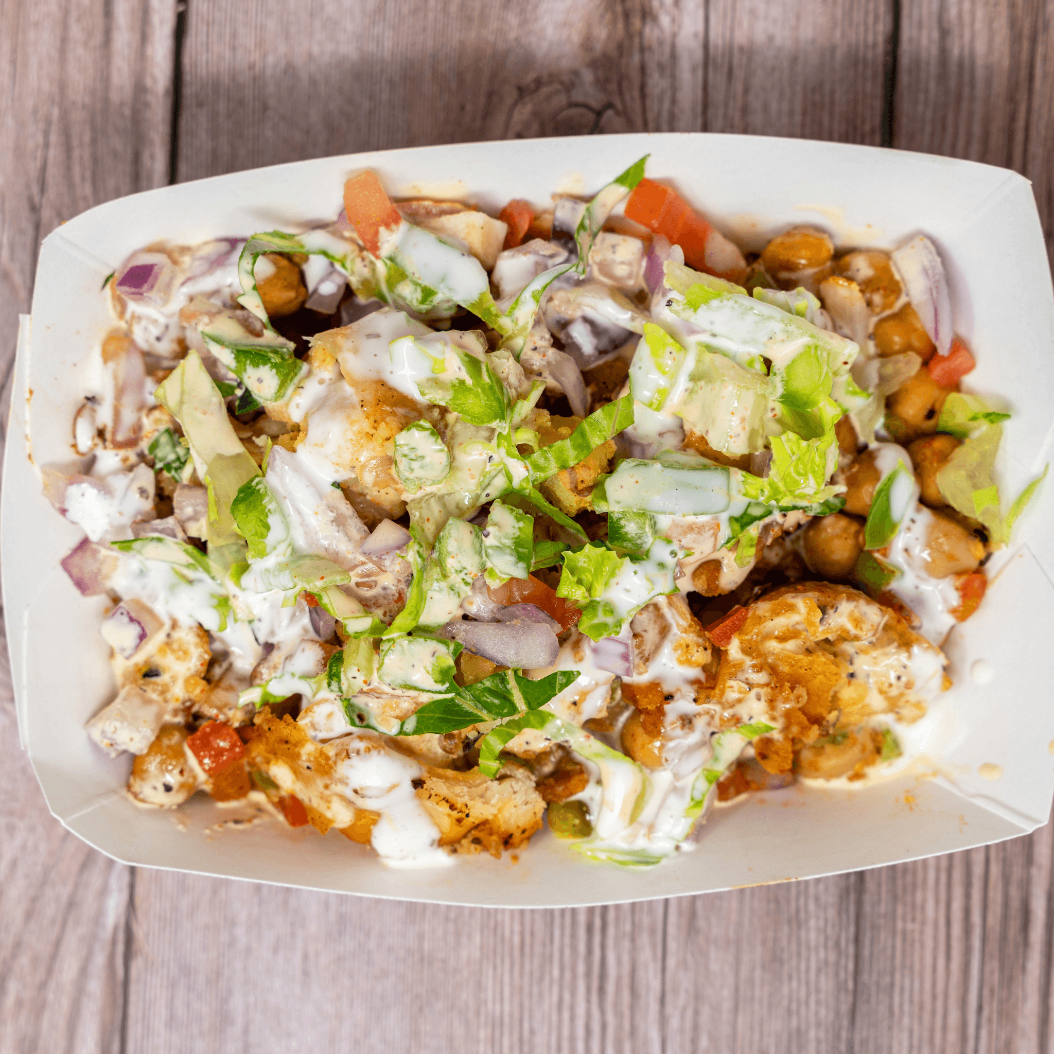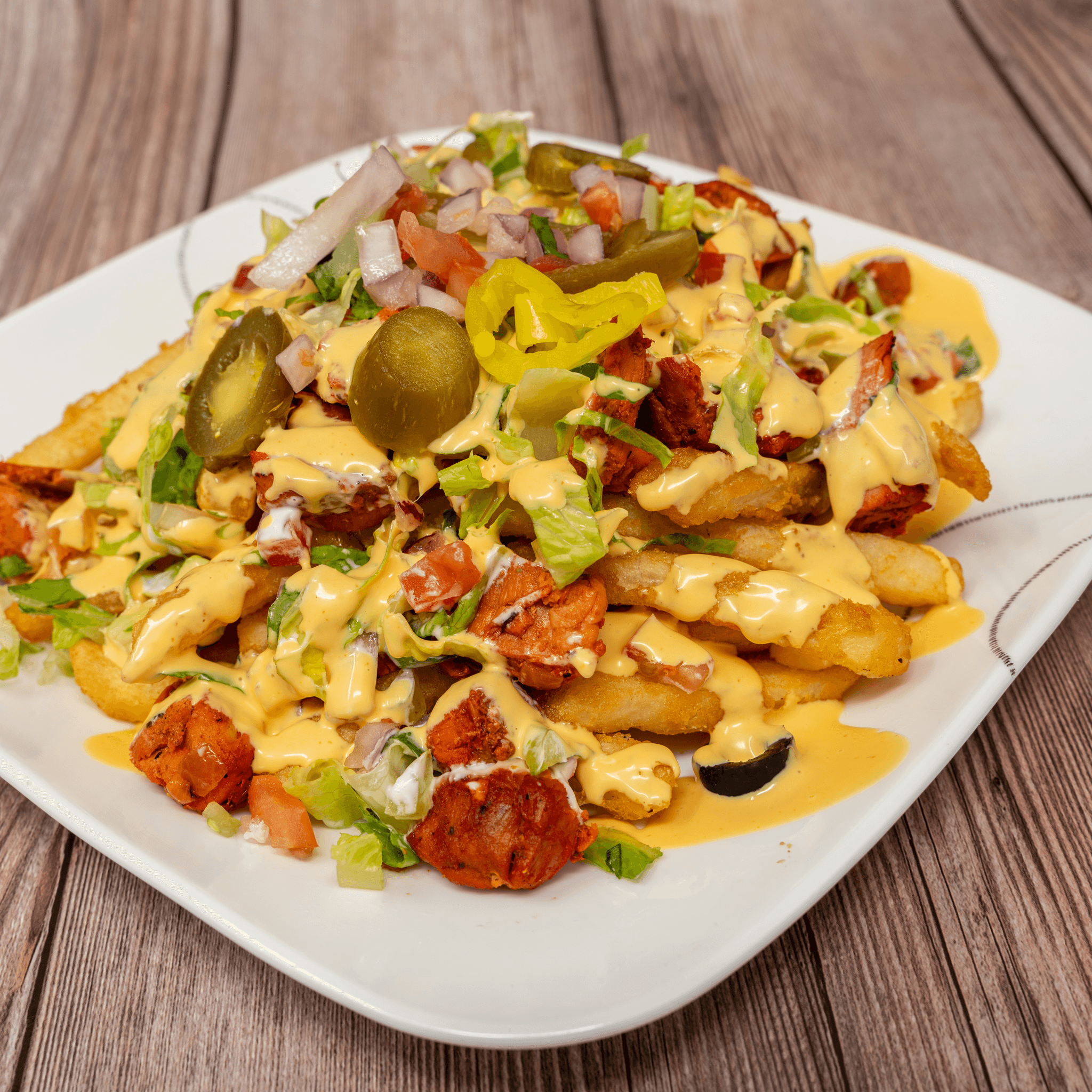 Golden crispy fries topped with a creamy cheese sauce, a choice of succulent chicken or lamb gyro, and finished with a sprinkle of spicy jalapenos and fresh salsa