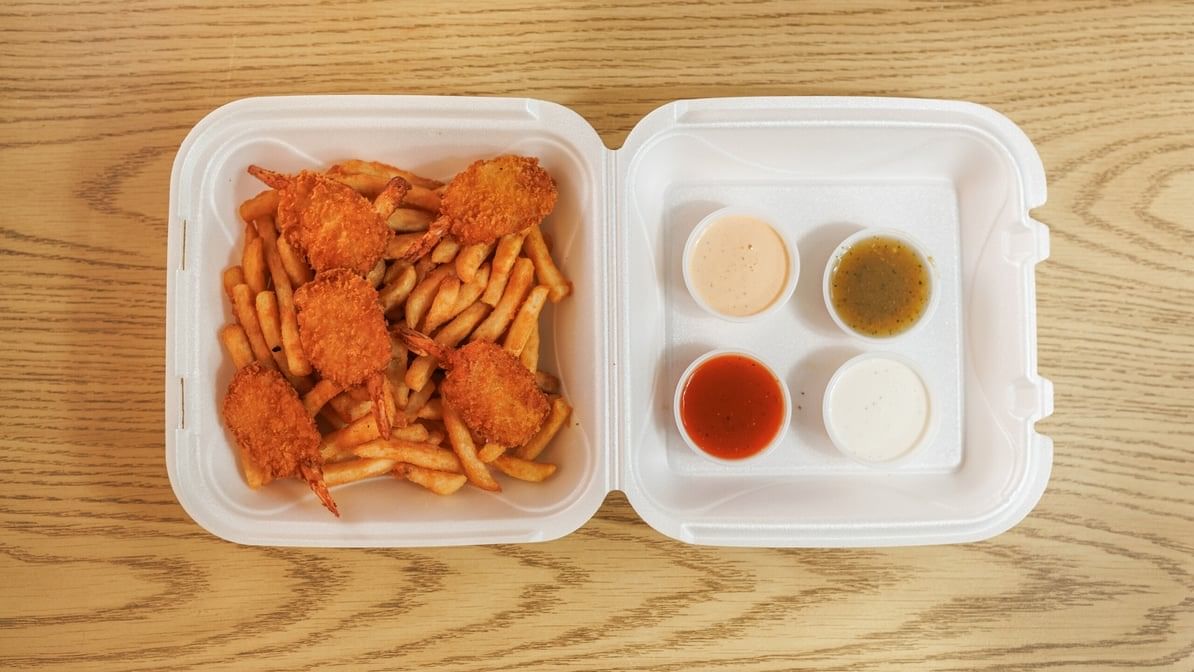 Golden fried shrimp with a light, crispy texture, served alongside perfectly crispy fries and a side of tangy marinara sauce