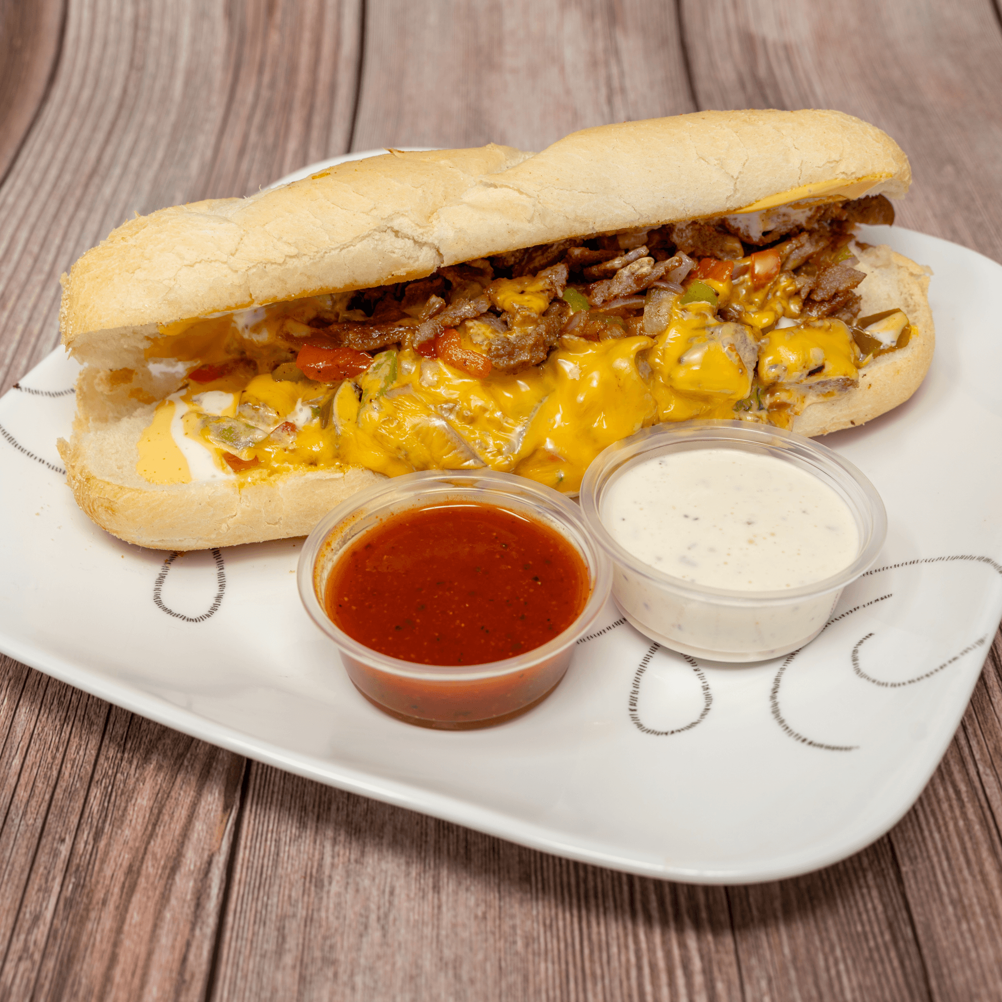 Thinly sliced steak, caramelized onions, and melted provolone cheese all tucked into a freshly baked hoagie roll
