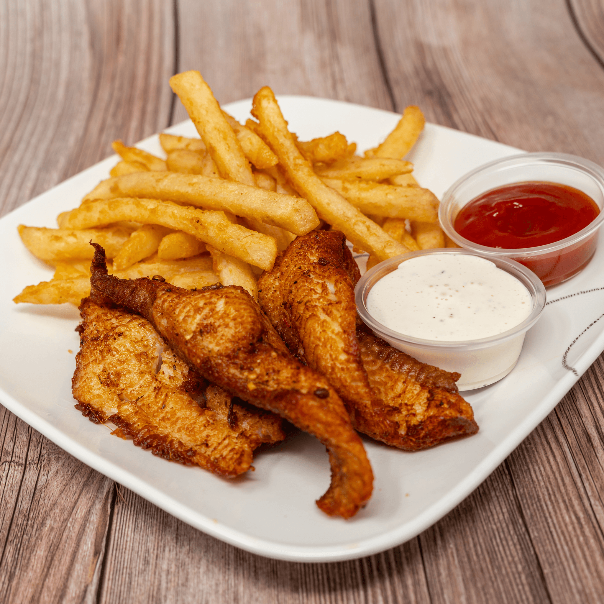 Crispy battered catfish fillets, perfectly fried, served alongside golden potato chips and complemented by our signature dipping sauces of your choice