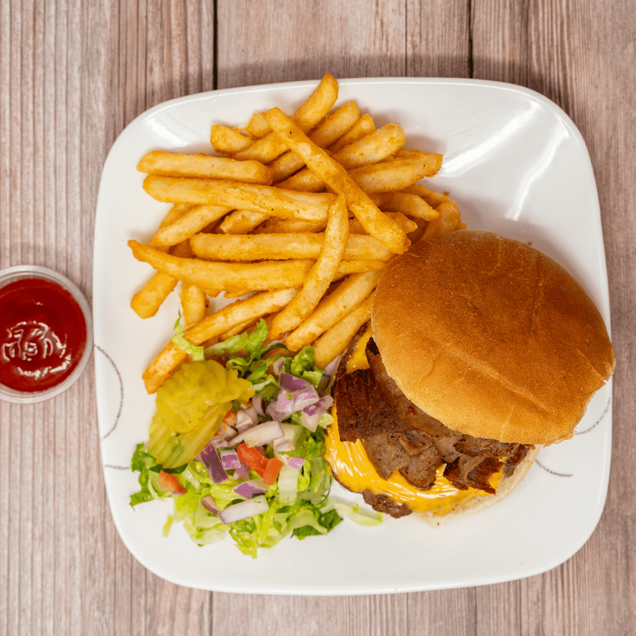 Enjoy a fusion of flavors with the Gyro Cheeseburger, featuring juicy, seasoned meat topped with crispy gyro slices and melted cheese. A perfect blend of savory goodness for an elevated burger experience