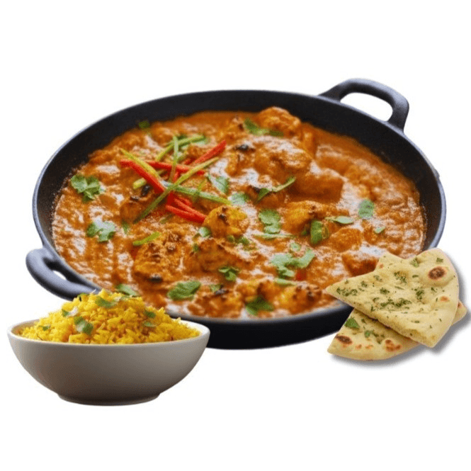 Tender, marinated chicken simmered in a rich, creamy tomato and butter sauce infused with warm indian spices. Smooth, mildly spiced, and full of flavor dish, served with a naan and a side of yellow basmati rice.